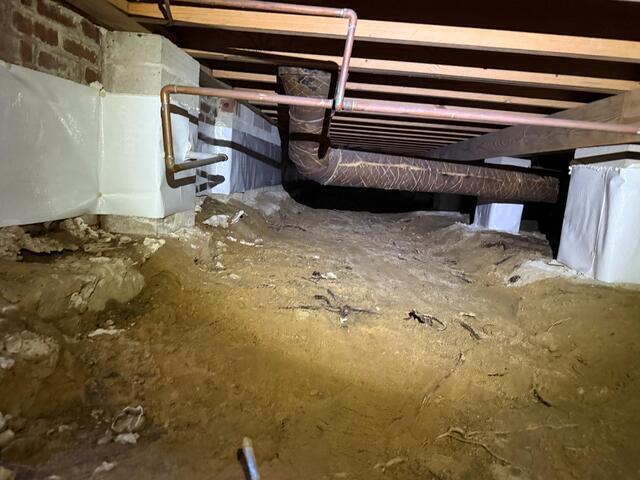 This crawlspace had exposed soil, moisture issues, and aging ductwork contributing to poor conditions beneath the home. The Cantey Foundation Specialists team cleaned and prepared the space before installing a full crawlspace encapsulation system with a durable vapor barrier to help manage moisture and improve long-term protection.