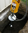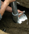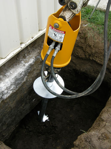 First, the soil is removed from the area where the helical pier will be installed. Helical pier sections are mechanically "screwed," or advanced, into the soil.