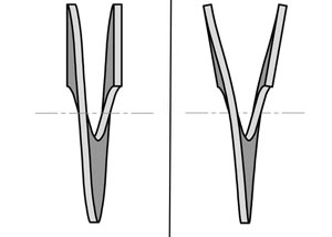 (Right) A nonconforming blade, with more of a "duckbill" appearance. This makes it churn up and disturb the soil during installation.