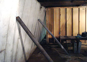 Poles were used to temporarily brace the foundation wall to prevent a total collapse.