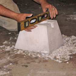 A pre-cast concrete base (or footing) is placed on top of the engineered fill and carefully leveled.