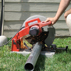 Once new bases have been installed, measurements are made for the steel crawl space jack posts, and the posts are cut to length.