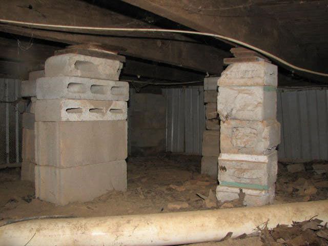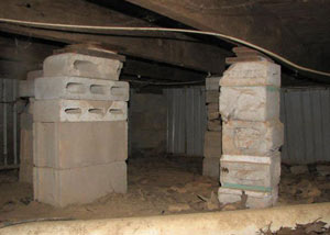 Some homeowners and contractors will attempt to use concrete blocks to repair a sagging crawl space, with wooden "shims" wedged in at the top to fill in any empty space.
