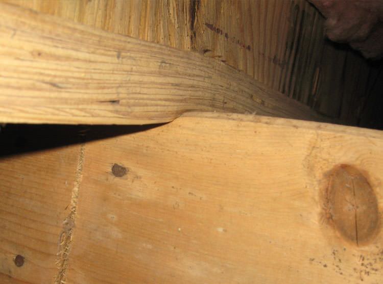 A floor joist shows signs of compression due to the weight of the home -- and too few support posts.