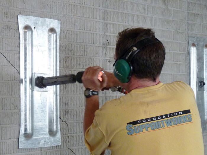 Mounting the steel wall plate for foundation wall repair and straightening in Kannapolis.
